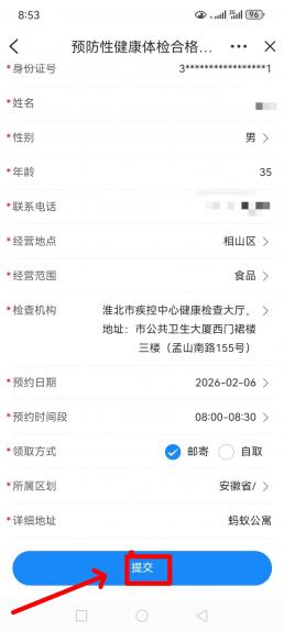 4、健康证领取可选择邮寄(免费)或自取的方式,未办理邮寄选择自取的人员请在5个有效工作日后,持办证票据到淮北市公共卫生大厦三楼从业人员健康检查服务大厅领取健康证。发证时间每周一到周五下午2:30-5:30(法定节假日除外)。